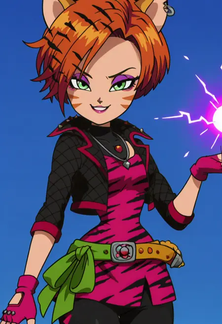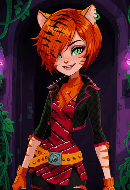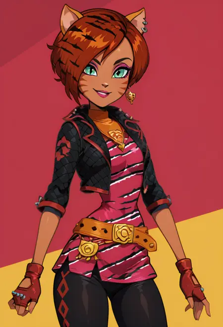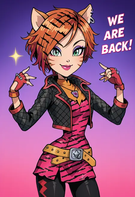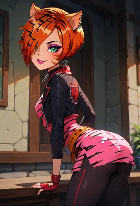 | 训练词汇 | zzToralei, green eyes, cat ears, tiger ears, hair over one eye, brown hair, multicolored hair, orange hair, red hair, short hair, whisker markings, facial mark,已复制! zzToralei, green eyes, cat ears, tiger ears, hair over one eye, brown hair, multicolored hair, orange hair, red hair, short hair, whisker markings, facial mark, makeup, gloves, jewelry, jacket, fingerless gloves, piercing, earrings, animal print, ear piercing, pink dress, black pants,已复制! |