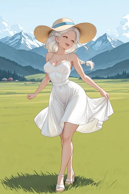 Trigger Cassia : Amazn, white long hair, ponytail, braid, winged helmet, face paint, collar, armored dress, Pauldrons, bracer, thigh strap, greaves, sandals, armlet