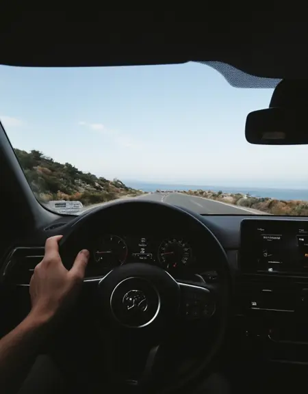 - 車内運転、車内、(ハンドルに手を置いている)