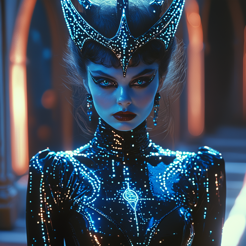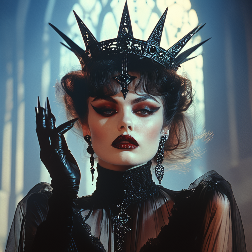 Mystic Vogue 80s Occult Pop is a striking fusion of 80s high-fashion aesthetics with dark, mystical, and occult influences.