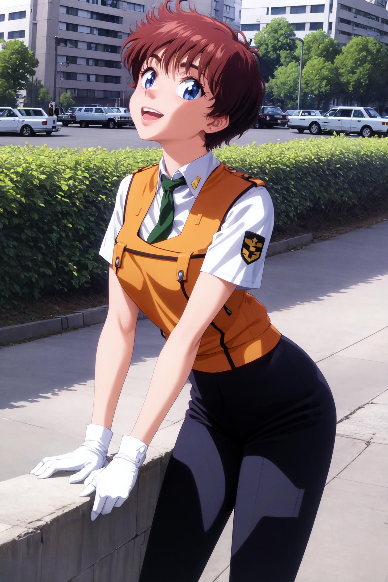 主な衣装には「IzumiNoaUniform, pants, white gloves, short hair, vest」、袖の長さには「short sleeves, long sleeves」を使用して、青または白の袖を再現してください。