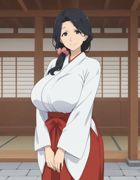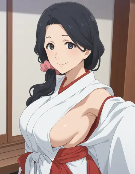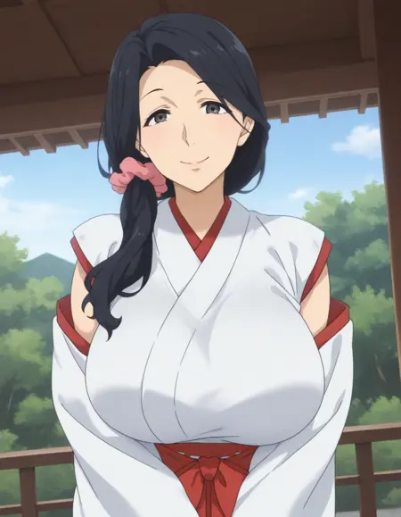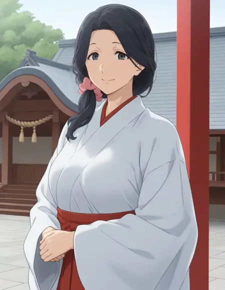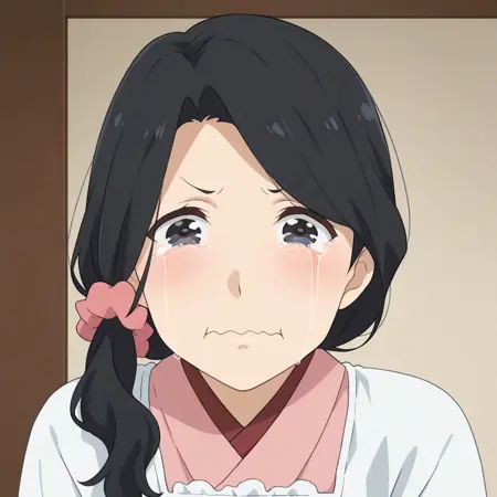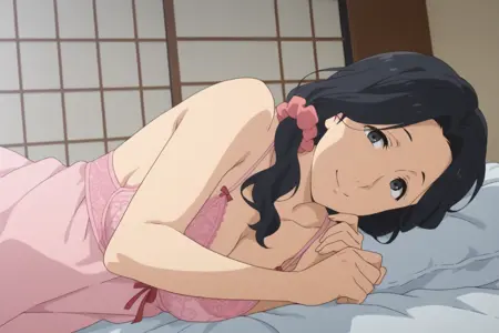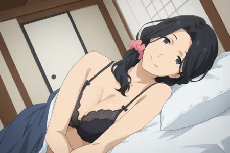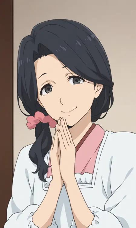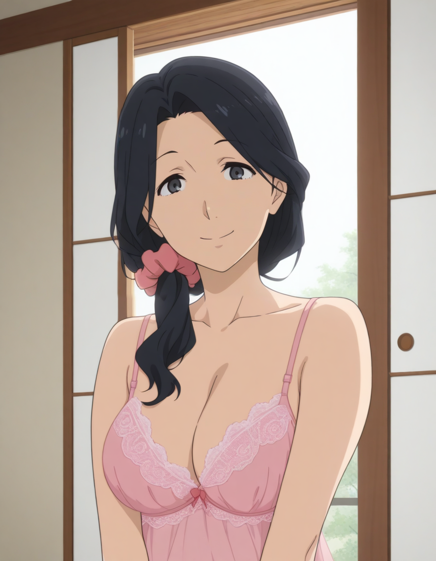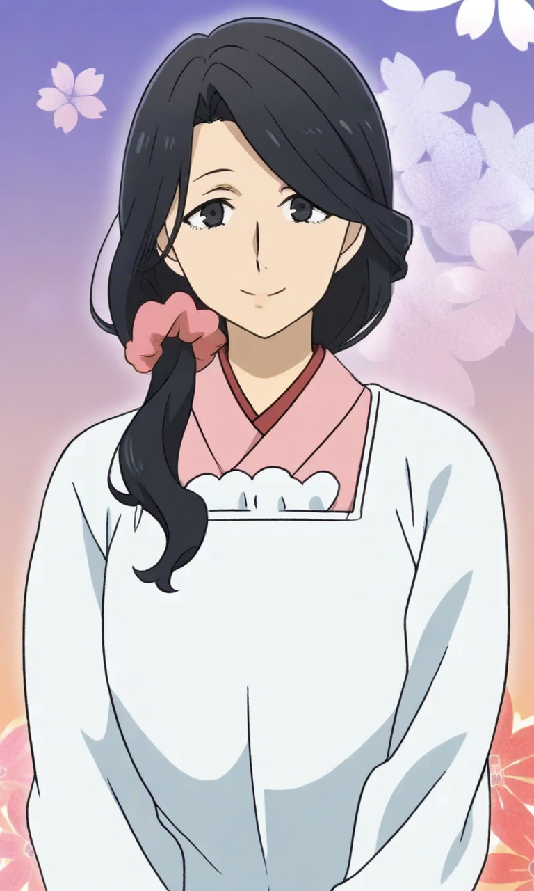 Handa Emi, mature female, black hair, black eyes, pink kimono, white kappougi, white socks, blue slippers, pink hair scrunchie, hair over shoulder, long hair