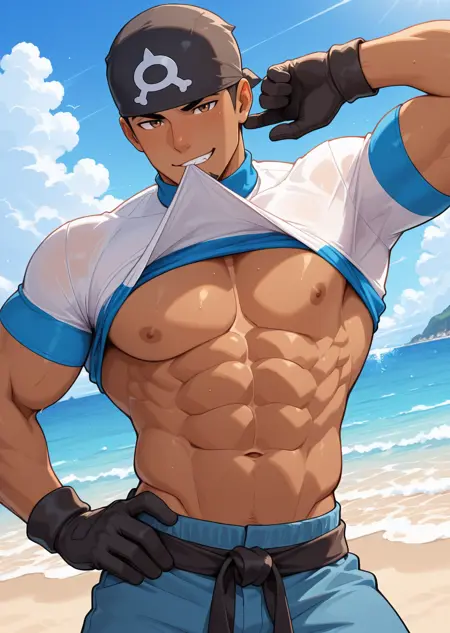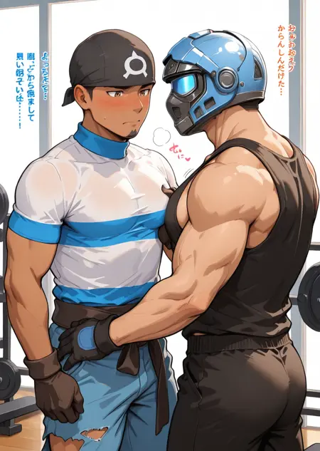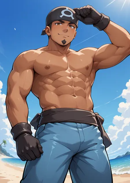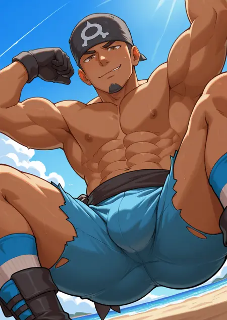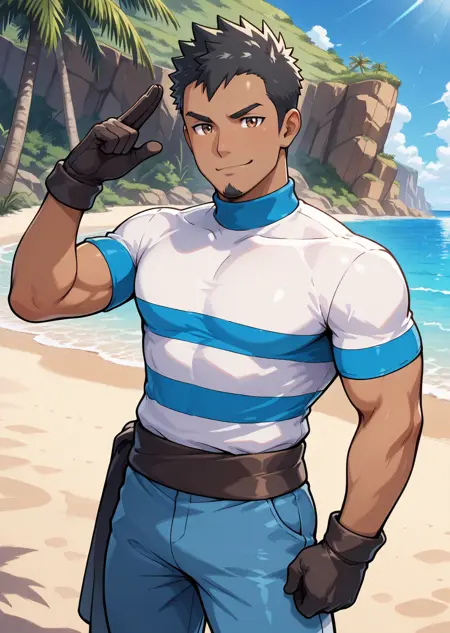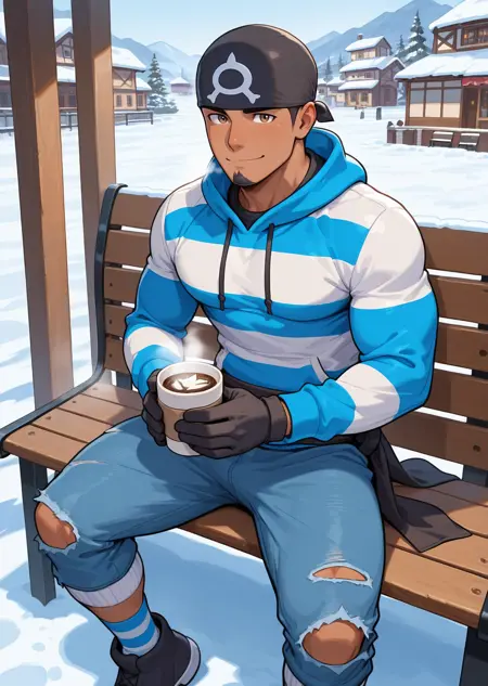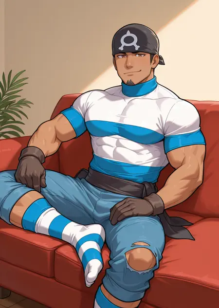 | Trained Words | 1boy, male focus, bandana, white and blue striped turtleneck shirt, short sleeve, pants, sash, gloves, muscular, bara, white background, black hair, dark skin, goatee, brown eyes, cowboy shot, poseCopied! 1boy, male focus, bandana, white and blue striped turtleneck shirt, short sleeve, ripped pants, white and blue striped socks, sash, gloves, muscular, bara, black hair, dark skin, goatee, brown eyes, pose, indoor, living room, sitting on sofa, relaxedCopied! 1boy, male focus, bandana, white and blue striped turtleneck shirt, short sleeve, ripped pants, white and blue striped socks, sash, gloves, muscular, bara, black hair, dark skin, goatee, brown eyes, pose, indoor, living room, sitting on sofa, relaxed, smirk, looking at viewerCopied! 1boy, male focus, bandana, white and blue striped turtleneck shirt, short sleeve, ripped pants, white and blue striped socks, sash, gloves, muscular, bara, black hair, dark skin, goatee, brown eyes, pose, indoor, sitting on sofa, blue sofa, dark stone wall, relaxed, smirk, looking at viewerCopied! 1boy, male focus, bandana, short sleeve, white and blue striped hoodie, (long sleeve), white and blue striped socks, sash, black gloves, muscular, bara, black hair, dark skin, goatee, brown eyes, ripped long pants, sitting on bench, snow, town, winter, snow fog, holding coffee, hot drink, looking at viewer, smileCopied! 1boy, male focus, bandana, white and blue striped turtleneck shirt, short sleeve, ripped pants, white and blue striped socks, boots, gloves, muscular, bara, dark skin, goatee, brown eyes, pose, black hair, sashCopied! |