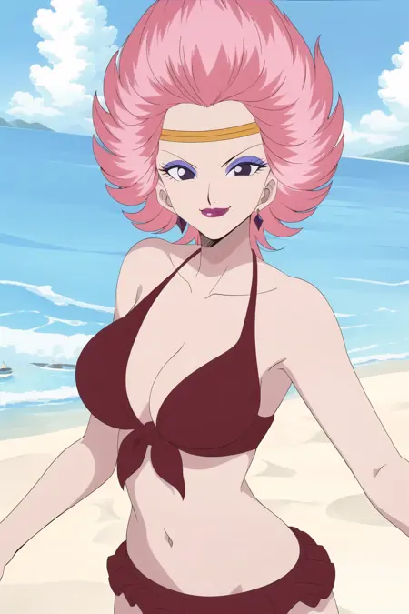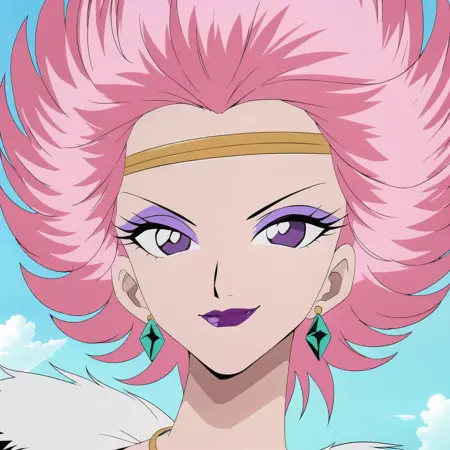 pink hair, short hair, purple eyes, makeup, lipstick, necklace, jewelry, fur trim
