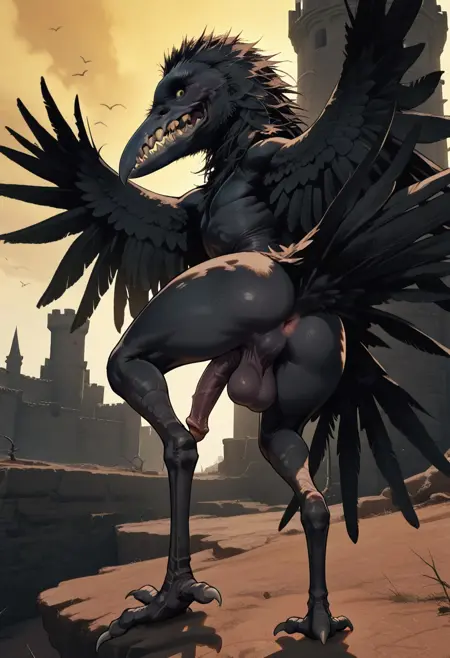 crow, mutant bird, wings, black feathered, big teeth, yellow eyes, claws