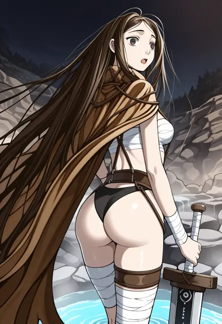 cloak, sarashi, thigh strap, belt suspender, bandages, panties