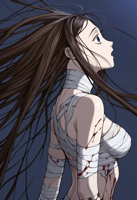 closed cloak, bandaged brests, bandaged arms, bandaged legs