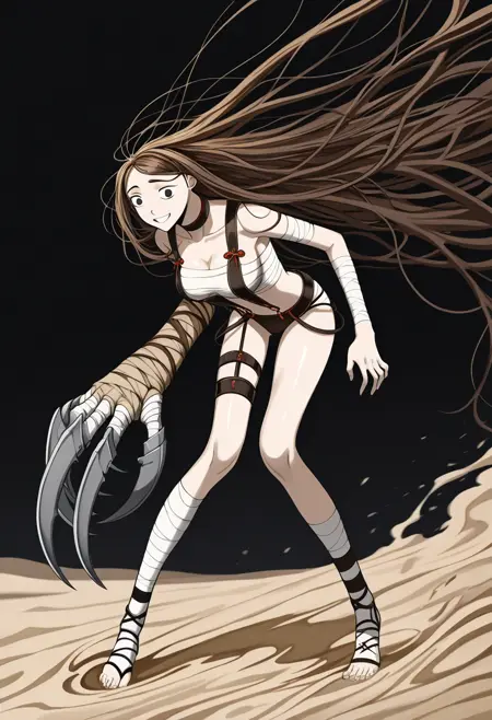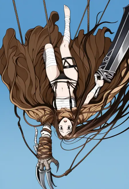 This version reproduces Sando's weapon much better than Flux, old Illustrious and of course the useless Pony version for weapons. Although this is achieved at the cost of variety in fighting poses. Sando's sword and her gloves require tags: