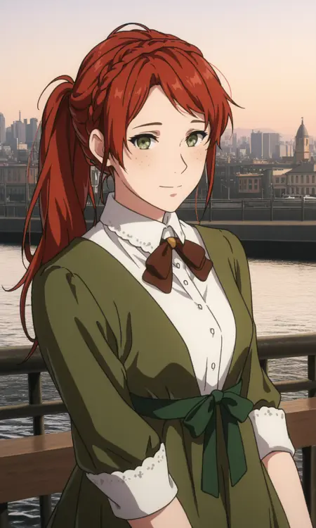 luculiamv, 1girl, solo, freckles, green eyes, long hair, red hair, crown braid,