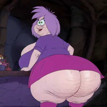 short body, overweight, elderly, witch, cartoon character, pale skin, lavender hair, green eyes. indigo shirt, magenta skirt, dark magenta sleeves, violet shoes, wrinkles, solo,