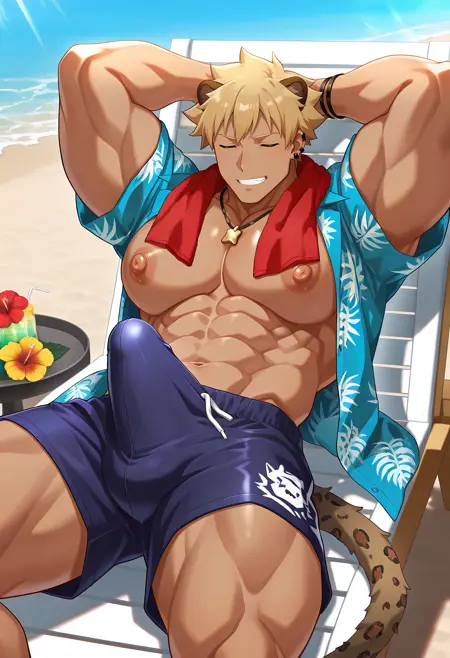 남성용 수영복, 벌어진 옷, 파란 하와이안 셔츠, 노랑 하이비스커스, 빨간 수건을 목에 두르다, 목걸이, 팔찌, 네일 포일, 검은 네일, 수영 바지, 샌들