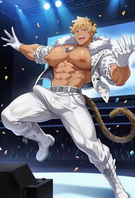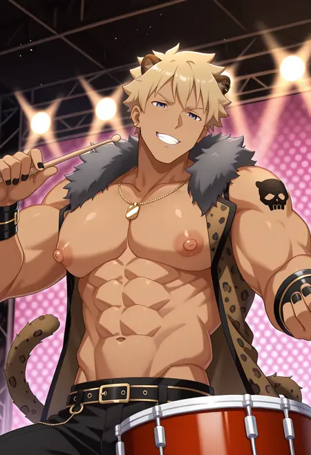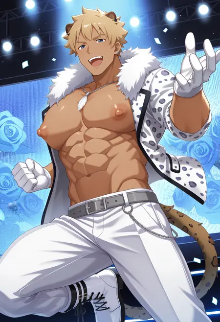 r0m_sb69, 金色头发, 蓝色眼睛, 深色皮肤男性, 动物耳朵, 豹纹耳朵, 耳钉, 尾巴, 豹纹尾巴
