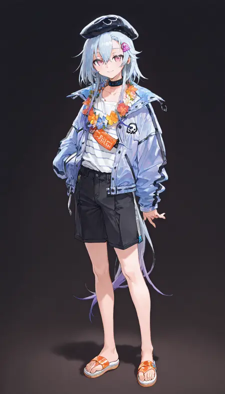 髪飾り、縞模様のシャツ、短めのズボン、花のネックレス、青いジャケット、サンダル,