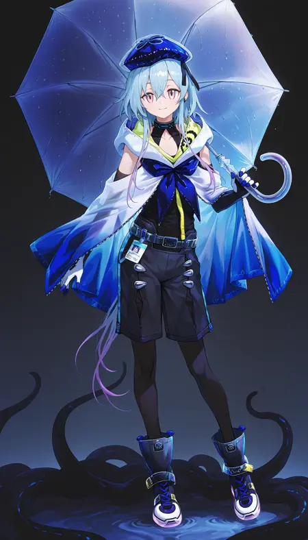 青髪、青い頭飾り、ピンクの目、グラデーション髪、ベレー帽,