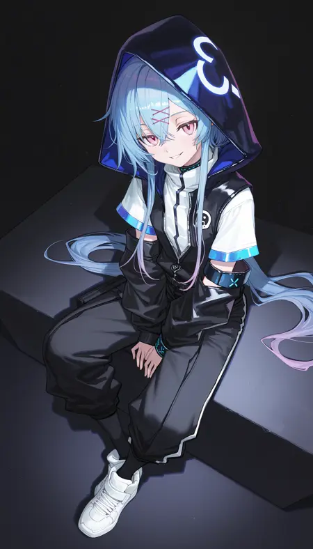 青髪、ピンクの目、グラデーション髪、フードをかぶっている、Xの髪飾り,