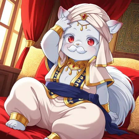 arabian clothes, turban, side_head_ornament, multiple collar, white capelet, arabian jacket, white sash, open clothes, fake mustache,
