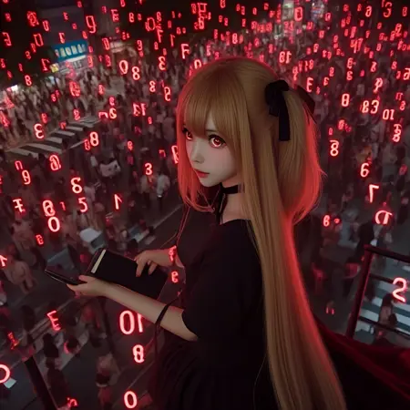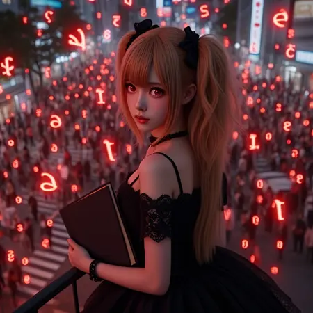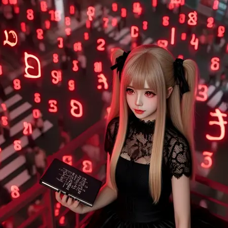 | 训练词汇 | amane misa, death note, red numbers, scribble numbers, realistic, sad, tears, crying, tearing up, 1girl, idol, skinny, kawaii, japanese female, brown eyes, red eyes, shinigami eyes, gothic dress, two side up, blonde hair, very long hair, cross necklace, black nails, black choker, black ribbon, black book, short sleeves, cleavage, breasts, night, city, crowd, tokyo, railing, balcony, crosswalk, overlooking, looking back, from behind, from above, light particles, red filter,已复制! |