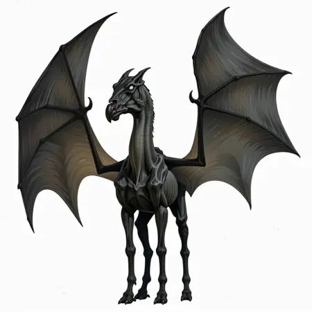 골격, 빈 눈, 네 다리의 말 같은 생물, 이 생물의 날개는 펼쳐져 있음