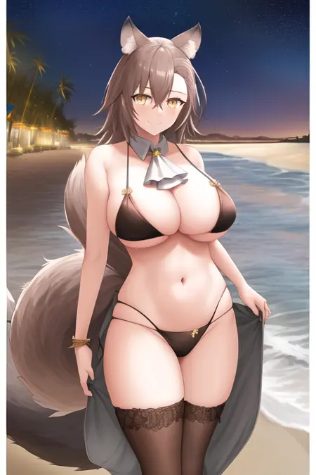 - 已剪枝的角色标签为:animal_ears, wolf_ears, long_hair, brown_hair, extra_ears, wolf_girl, yellow_eyes, breasts, bangs, large_breasts, tail, hair_between_eyes, wolf_tail, braid。当角色的核心特征(例如发色)不够稳定时,你可以将这些标签加入提示词中。