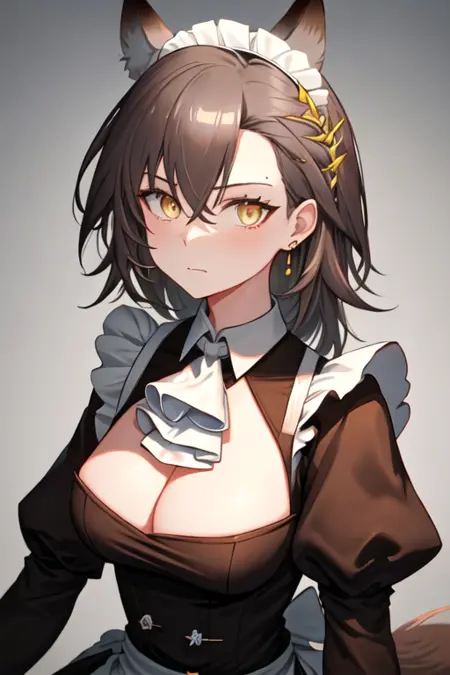 - 已剪枝的角色标签为:animal_ears, wolf_ears, long_hair, brown_hair, extra_ears, wolf_girl, yellow_eyes, breasts, bangs, large_breasts, tail, hair_between_eyes, wolf_tail, braid。当角色的核心特征(例如发色)不够稳定时,你可以将这些标签加入提示词中。