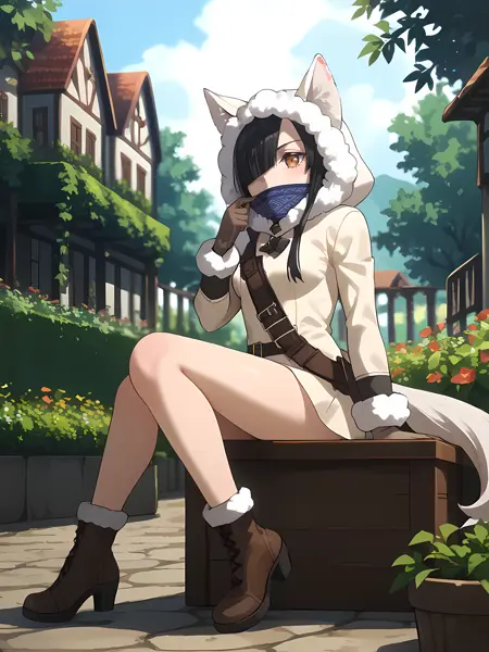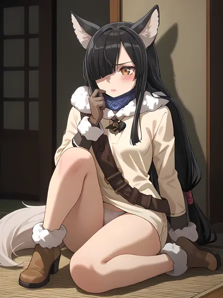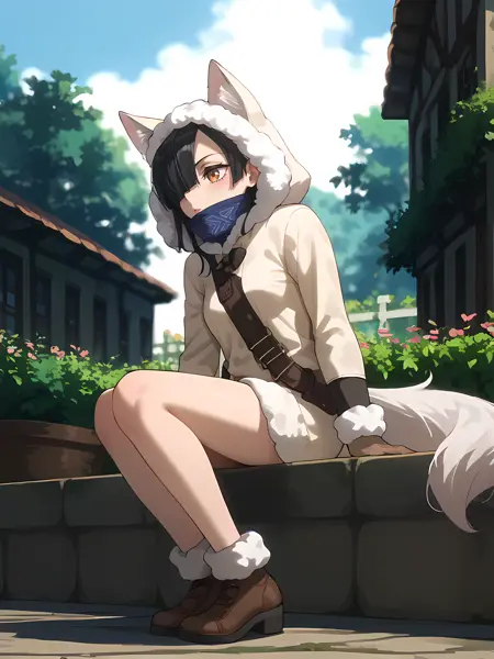 genomew,fox ears, black hair,hair over one eye, brown eyes, white tail, low-tied long hair,