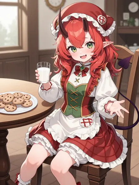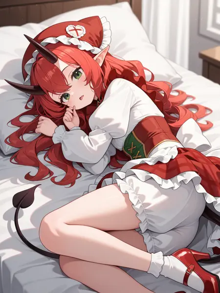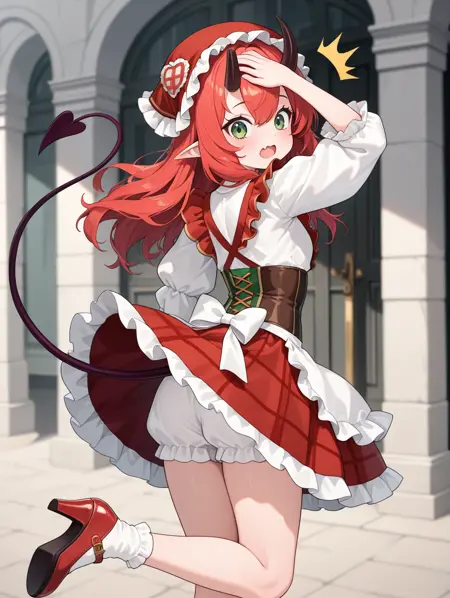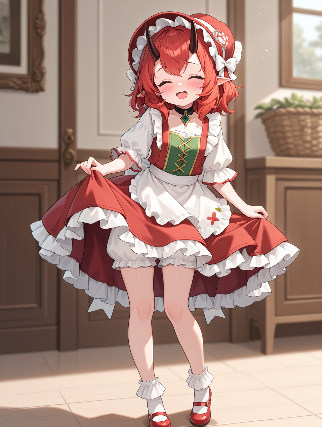 paimon, 1girl, solo, 긴 머리, 치마, 셔츠, 긴 소매, 모자, 드레스, 눈 사이의 머리카락, 녹색 눈, 꼬리, 흰색 셔츠, 빨간 머리, 프릴, 뿔, 신발, 뾰족한 귀, 양말, 퍼프 소매, 앞치마, 하이힐, 체크무늬, 악마 소녀, 프릴 드레스, 흰색 양말, 빨간 신발, 악마 꼬리, 코르셋, 피부 이빨, 블루머,
