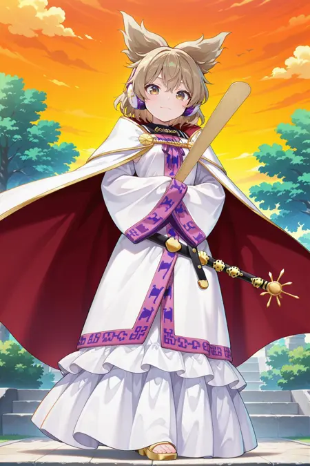 toyosatomimi no miko, 1girl, solo, brown eyes, brown hair, short hair, pointy hair, toyosatomimi no miko \(principles of the white sunrise\), アルターナティブコスチューム, 耳あて, 両面キャップ, 白いキャップ, 赤いキャップ, 金のトリム, 重ね着の着物, 白い着物, 長い袖, 広い袖, 袖が手首より長い, 袖が指先より長い, 白いドレス, 長いドレス, 白いウエストリボン, 鞘, 祭具の棒, 金の靴,
