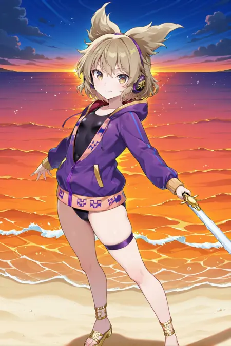 toyosatomimi no miko, 1girl, solo, brown eyes, brown hair, short hair, pointy hair, toyosatomimi no miko \(almighty taoist ruling over the sea\), アルターナティブコスチューム, 耳あて, 二色ホッディー, 紫のホッディー, オレンジのホッディー, 長い袖, 開いたホッディー, ジッパー, 一体型水着, 黒い水着, 紫の太ももストラップ, 足元ジュエリー, リボントリム付き靴, 金のサンダル, 剣を持っている, インフレータブル剣, ジェットスキー,