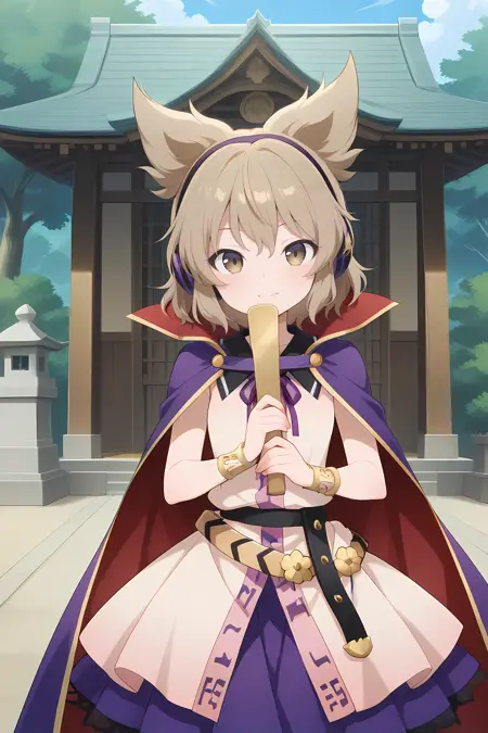 toyosatomimi no miko, 1girl, solo, brown eyes, brown hair, short hair, pointy hair, toyosatomimi no miko \(desires\), アルターナティブコスチューム, 耳あて, 首元リボン, 紫のリボン, 袖なしドレス, 金のブレスレット, 黒いベルト, 紫のスカート, 持っている, 祭具の棒, 鞘,