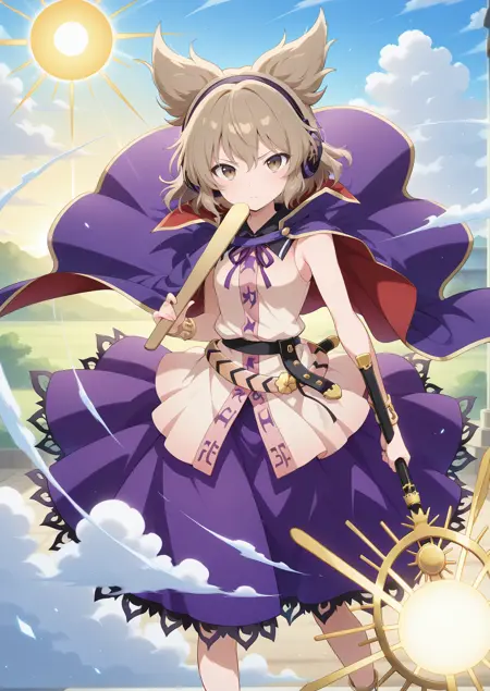 toyosatomimi no miko, 1girl, solo, brown eyes, brown hair, short hair, pointy hair, toyosatomimi no miko \(sentimental signals\), adapted costume, earmuffs, white cape, beads, purple neck ribbon, yellow dress, sleeveless dress, wrist cuffs, black belt, jewelry, purple skirt, frilled skirt, black frills, black boots, silver sword,