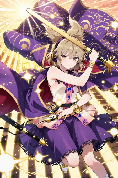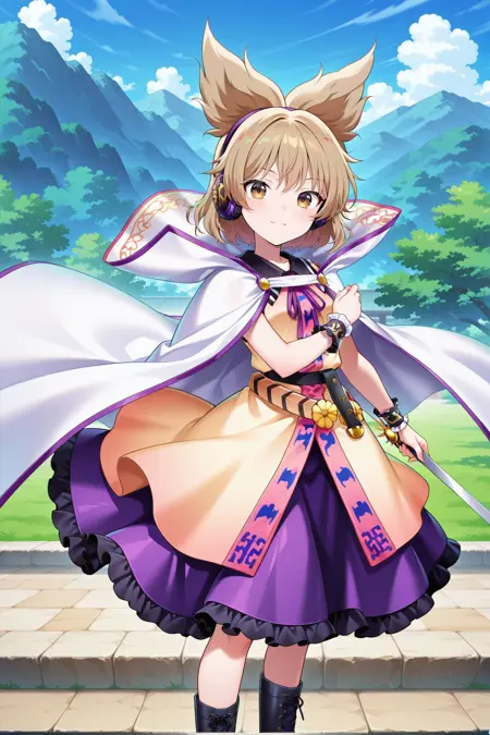 toyosatomimi no miko, 1girl, solo, brown eyes, brown hair, short hair, pointy hair, toyosatomimi no miko \(sentimental signals\), adapted costume, earmuffs, white cape, beads, purple neck ribbon, yellow dress, sleeveless dress, wrist cuffs, black belt, jewelry, purple skirt, frilled skirt, black frills, black boots, silver sword,