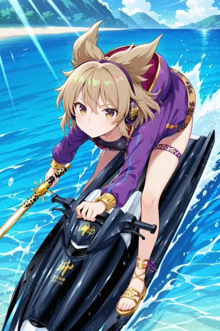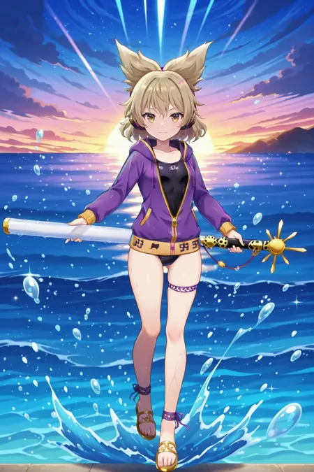 toyosatomimi no miko, 1girl, solo, brown eyes, brown hair, short hair, pointy hair, toyosatomimi no miko \(almighty taoist ruling over the sea\), alternate costume, earmuffs, two-tone hoodie, purple hoodie, orange hoodie, long sleeves, open hoodie, zipper, one-piece swimsuit, black swimsuit, purple thigh strap, foot jewelery, ribbon-trimmed footwear, gold sandals, holding sword, inflatable sword, jet ski,