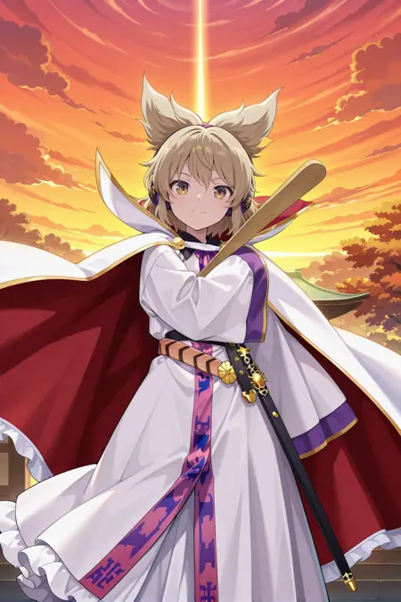 toyosatomimi no miko, 1girl, solo, brown eyes, brown hair, short hair, pointy hair, toyosatomimi no miko \(principles of the white sunrise\), alternate costume, earmuffs, two-sided cape, white cape, red cape, gold trim, layered kimono, white kimono, long sleeves, wide sleeves, sleeves past wrists, sleeves past fingers, white dress, long dress, white waist ribbon, sheath, ritual baton, gold shoes,