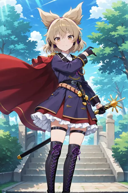 toyosatomimi no miko, 1girl, solo, brown eyes, brown hair, short hair, pointy hair, toyosatomimi no miko \(stable door prince's harmony\), alternate costume, earmuffs, red cape, military uniform, gold epaulettes, gold trim, blue coat,collared shirt, white shirt, black gloves, half gloves, black belt, gold chain, red skirt, frilled skirt, petticoat, thigh strap, lace-up boots, thigh boots, high heel boots, black boots, sheath, holding sword,