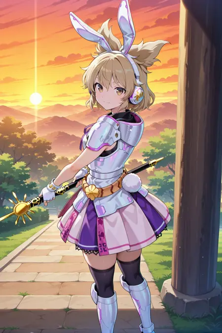 toyosatomimi no miko, 1girl, solo, brown eyes, brown hair, short hair, pointy hair, toyosatomimi no miko \(golden sword easter bunny\), alternate costume, animal ear headphones, white headphones, fake animal ears, nontraditional playboy bunny, white armored dress, pink trim, white breastplate, shoulder armor, armored white gloves, fingerless gloves, white bracelet, black shirt, white belt, two-tone skirt, pink skirt, white skirt, pleated skirt, rabbit tail, fake tail, armored boots, high heel boots, white boots, sheath, sword, ritual baton,