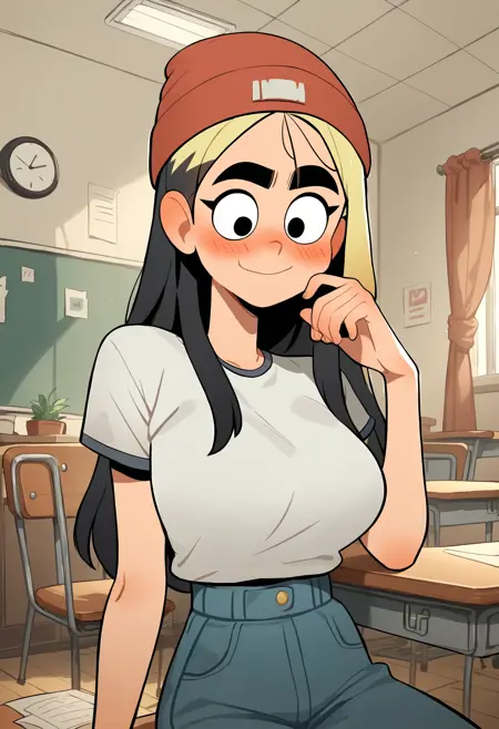 Mel from UAHP, the pilot material from Alex Hirsh (Gravity Falls creator) and Netflix. Flexible model, supports couple of hat versions, different colored hair, supports the word (thin) or allow the model to make her thicker. Supports sketches and line-art versions too.
