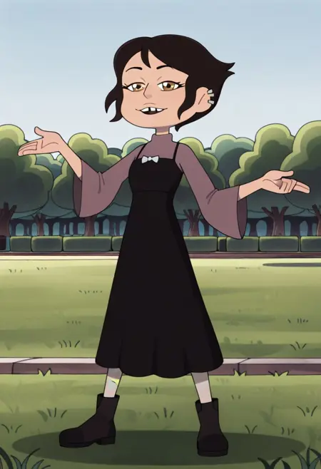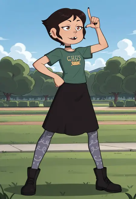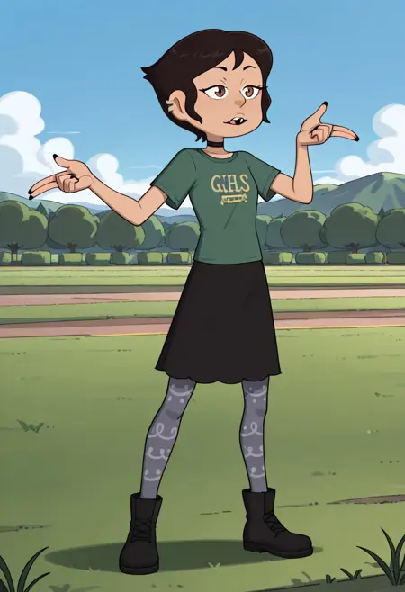 Masha, medium-tan complexion, pixie cut, brown eyes, ear piercing, tooth gap, t-shirt, plain black choker, black skirt, dusty grayish-blue patterned stockings, black ankle boots, multi color fingernails,