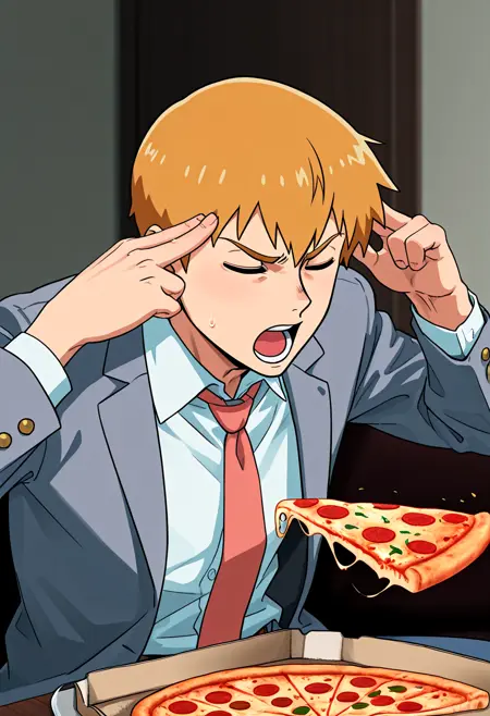 Trigger word: pizzakinesis, man levitating pizza (meme), pizza slice, floating food, fingers to head