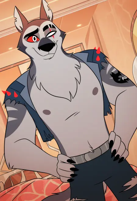 vortex \(helluva boss\), vortex, anthro, furry, furry male, 빨간 공막, 이색성 동공, (빈 유리 눈), 눈을 가로지르는 흉터, 동물 귀, 늑대 귀, 꼬리, 늑대 꼬리, 몸 털, 회색 털, 발톱, 팔 문신