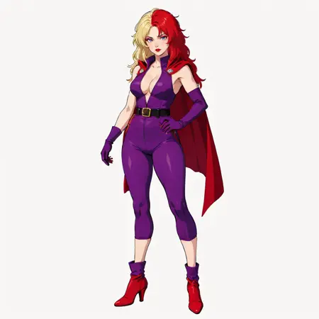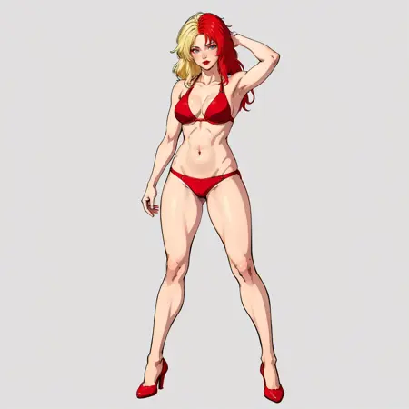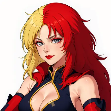 long hair,multicolored hair,two-tone hair,split-color hair,blonde hair,red hair,makeup,grey eyes,lipstick,