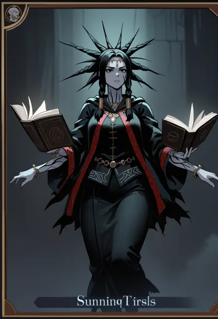 옷 태그: 원형 관모, 목걸이, 검은 로브, 넓은 소매, 긴 소매, 검은 망토, 붉은 테두리, 팔찌, 발목줄