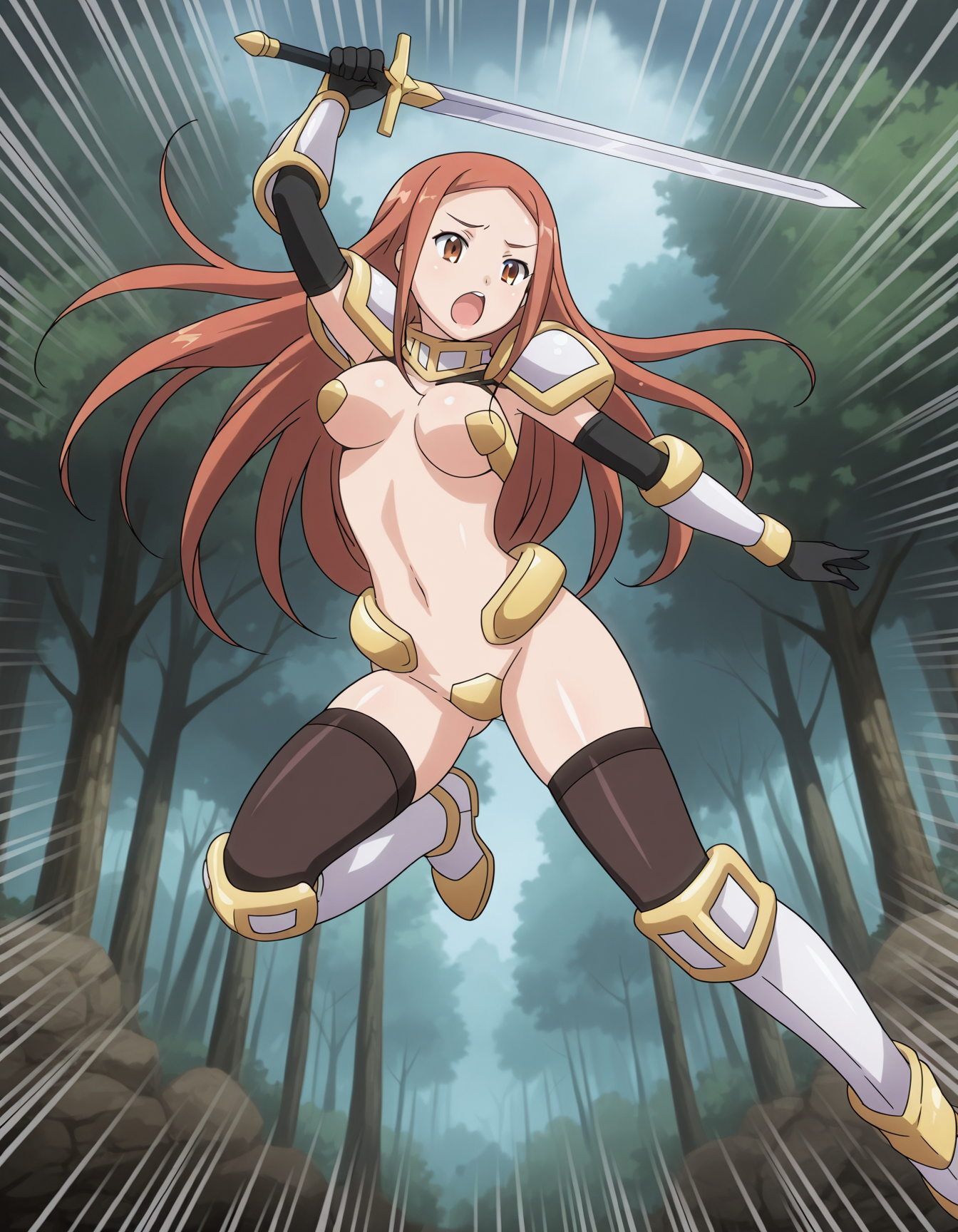 骑士1:长发,橙色头发,橙色眼睛,比基尼铠甲,肘部手套,过膝袜,靴子