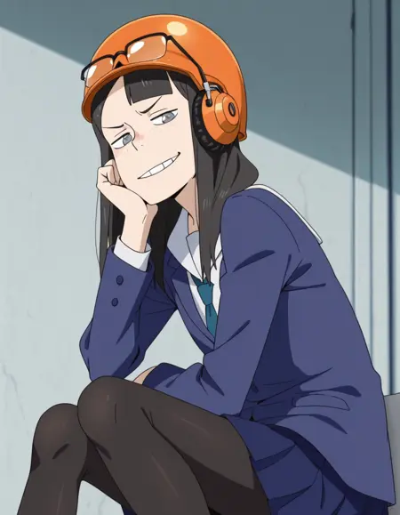- kanamoney, 单人, 长发, 灰色眼睛, 刘海, 黑发, 眼镜, 眼镜戴在头上, 上框眼镜, 牙齿, 雀斑, 不对称刘海, 微笑, 校服, 夹克, 连裤袜, 百褶裙, 领带, 蓝色裙子, 黑色连裤袜, 西装外套, 棕色鞋子, 半框眼镜,