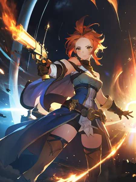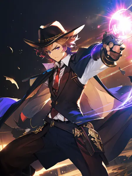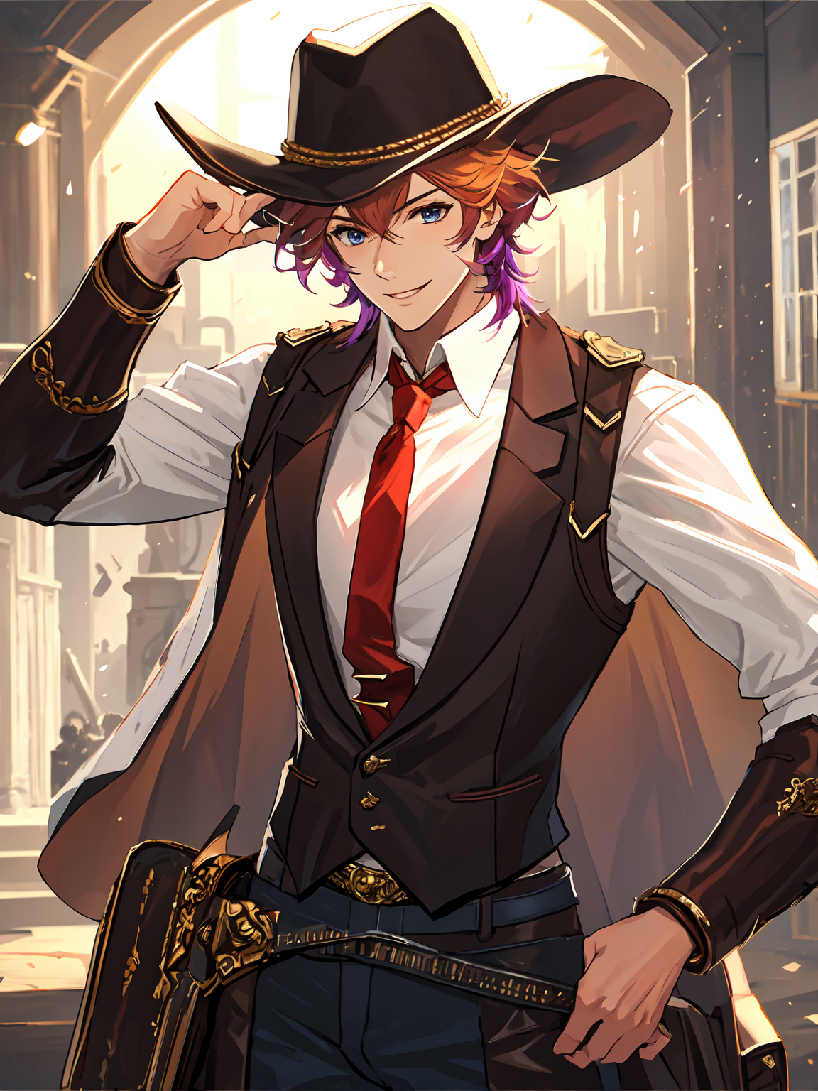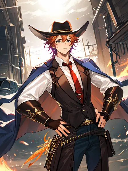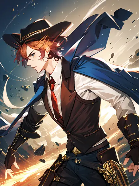 Maiser : Maiser ; Orange hair,gradient hair(multicolored hair),messy hair,blue eyes ; Vests,white shirt,(red)necktie,hat,jacket(cape),belt,sheath,leather pants,fingerless gloves,(gauntlets);
