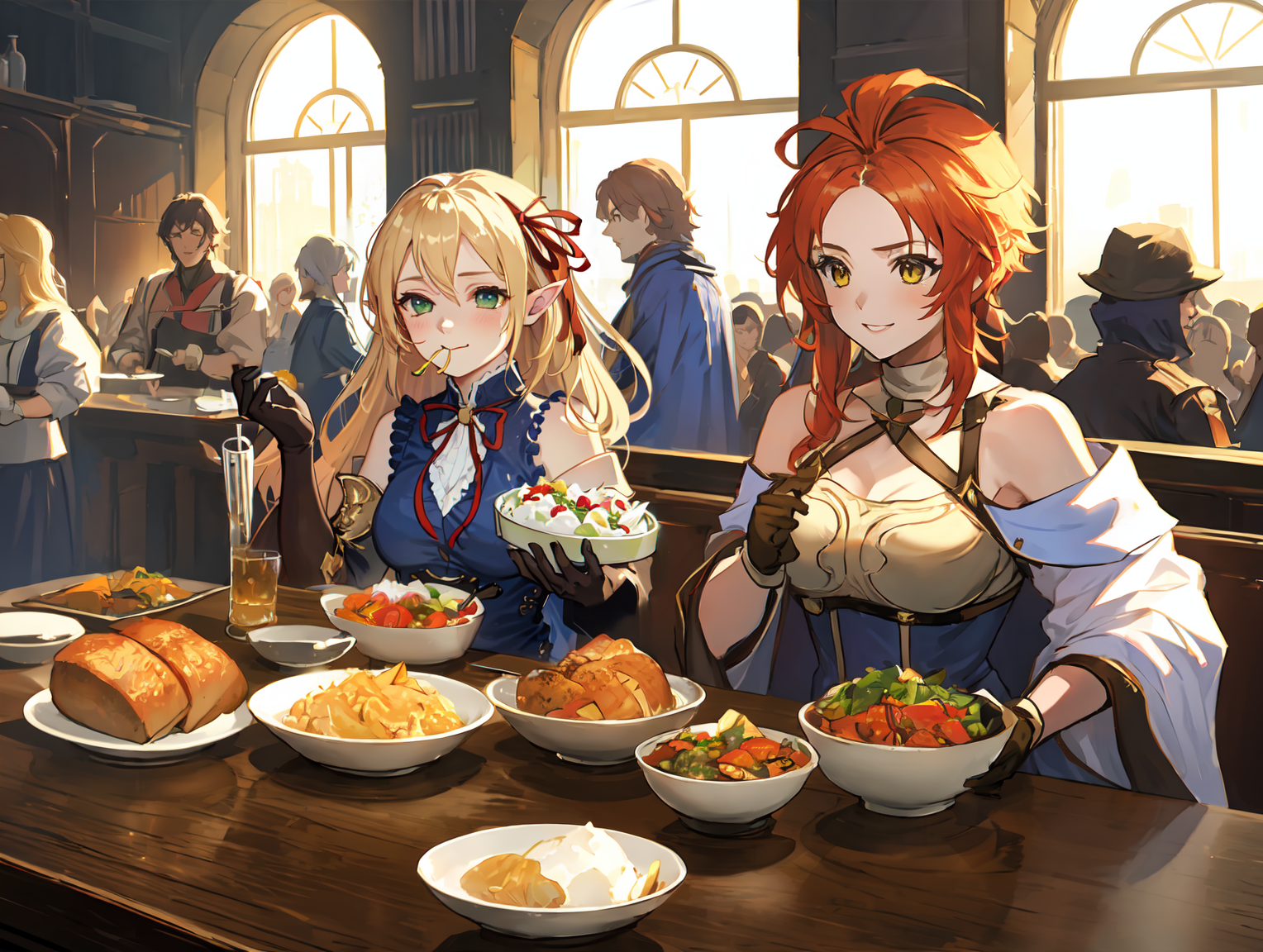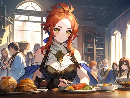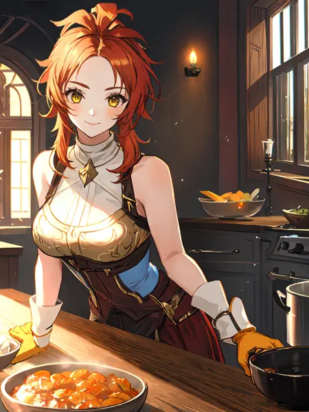 Selena : Selena ; Orange hair,ahoge,(parted bangs),yellow eyes,bare shoulders,white shirt,breastplate,blue dress,long skirt,thighhighs,clothing cutout,belt,gloves,hair ribbon,(capelet) ;