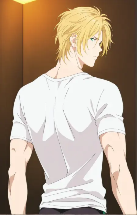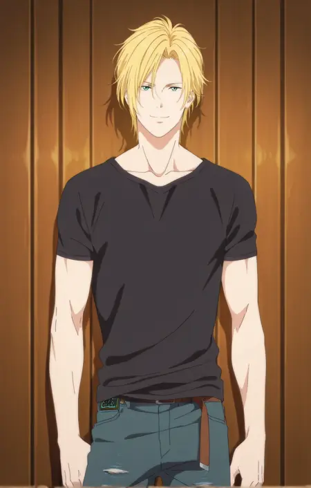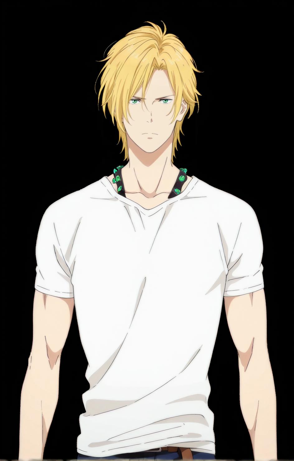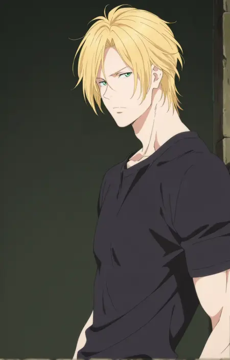 ash,ash lynx, blonde hair, green eyes, parted bangs,