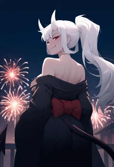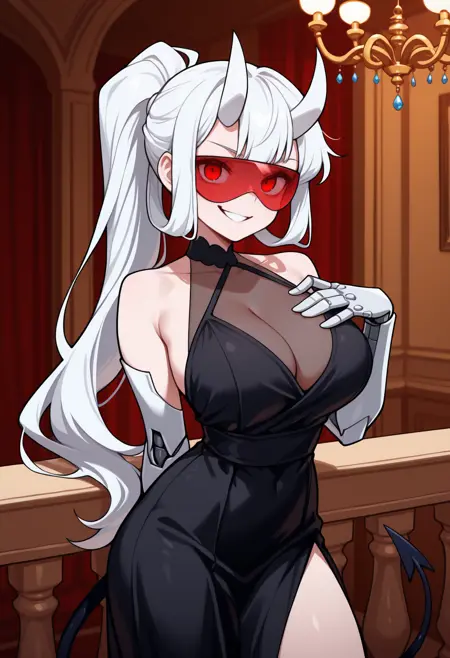 トリガー+外見: lor3m4ster, 機械式の腕, 悪魔の尾, 白髪, ポニーテール, 白い角, 悪魔の角, 赤い目