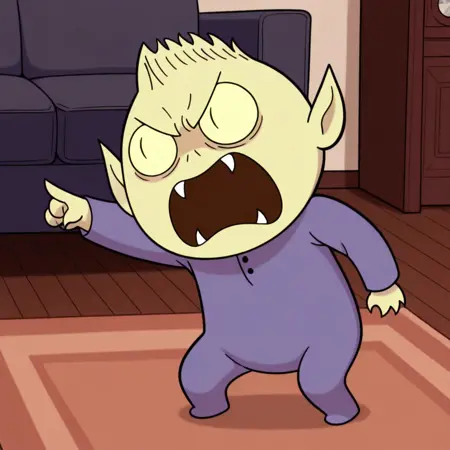 1boy, male, solo, chibi, yellow skin, short mohawk, yellow sclera, slit pupils, slit nostrils, pointy ears, fangs, purple pajamas