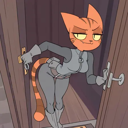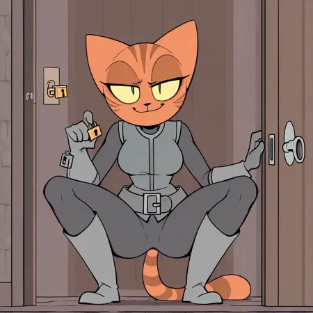 Thief: ORThief, orange fur, yellow sclera, slit eyes, bodysuit, gray shirt, belt, boots, gloves, striped tail