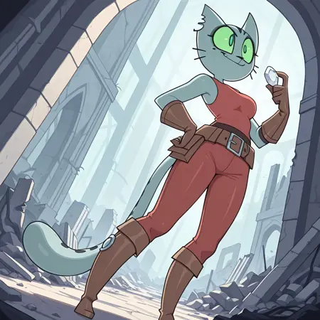 Kocia: Kocia, earrings, green sclera, green eyes, red top tank, pants, belt, belt pouch, boots, gloves, nipped ear